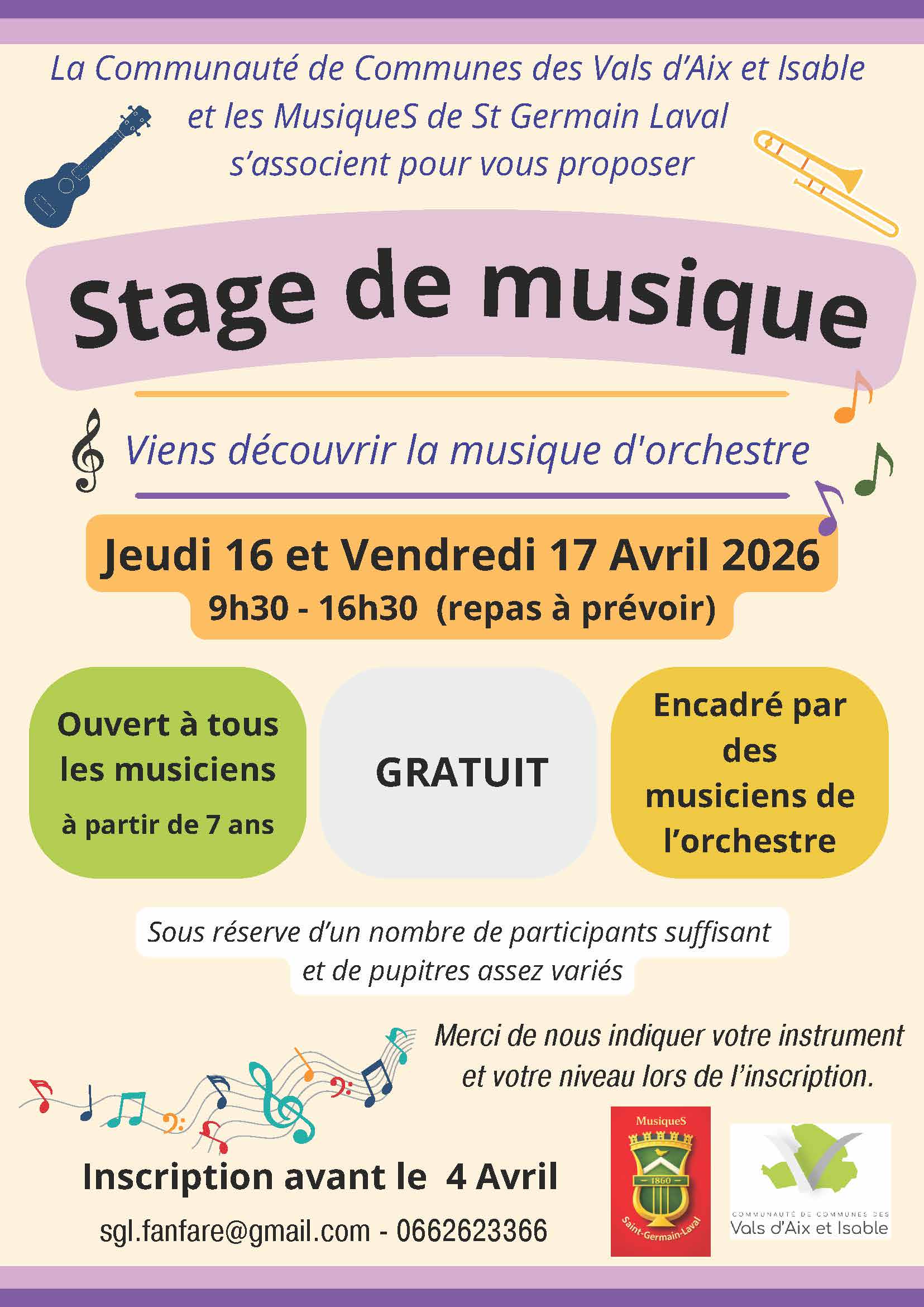 En ce moment, l'école de musique et les MusiqueS de St Germain Laval vous proposent un stage de musique sur le thème de l'orchestre ! 2 jours de stage gratuits, encadrés par des musiciens. Le stage à lieu à la Maison Boissieu (St Germain Laval). Inscrivez-vous vite !