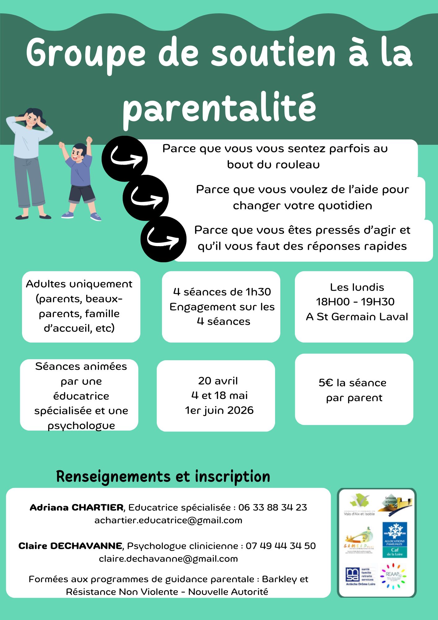 - C'est quand ?  Les lundis 20 avril, 4 et 18 mai et 1er juin 2026 à St Germain Laval. Il s'agit d'un groupe fermé au nombre de places limitées, la présence aux 4 rencontres est demandée.